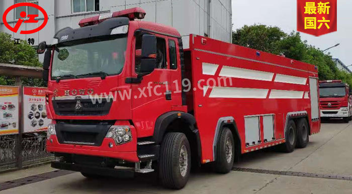 JDF5420GXFPM240/Z6型重型泡沫消防車為國六消防車車型,采用重汽豪沃ZZ5447TXFV466MF1底盤改裝而成。整車由消防員乘員室和車身兩大部分組成,乘員室為原裝單排,可乘坐2人,該車為外露罐結構,中部為罐體,后部為泵房。載液罐體為優質碳鋼,內部噴涂環氧底漆及環氧瀝青漆,與底盤采用彈性連接,載水量21260kg,泡沫液量2990kg(PM240),裝備了上海茸申消防設備有限公司生產CB10/80-1RS型常壓消防泵,額定流量80L/S,車頂安裝成都威斯特消防機械有限公司生產的PL8/64型車用消防炮。該車最大的特點是載液量大、操控性好、維修簡便?蓮V泛應用于公安消防隊、廠礦企業及社區、碼頭等場所,撲救大型油類火災和一般物質火災。