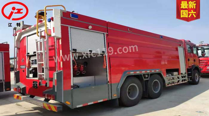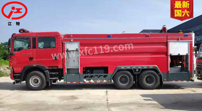 JDF5314GXFSG160/Z6型水罐消防車為國六消防車車型,采用重汽豪沃ZZ5357TXFV464MF5底盤改裝而成。整車由消防員乘員室和車身兩大部分組成,乘員室為原裝雙排,可乘坐2+4人,該車為外露罐結構,車身前部為器材箱,中部為水罐,后部為泵房。載液罐體為優質碳鋼,內部噴涂環氧底漆及環氧瀝青漆,與底盤采用彈性連接,載水量16150kg,裝備了上海茸申消防設備有限公司生產CB10/60-RS型中低壓消防泵,額定流量60L/S,車頂安裝成都威斯特消防機械有限公司生產的PS60W型車用消防炮。該車最大的特點是載液量大、操控性好、維修簡便。可廣泛應用于公安消防隊、廠礦企業及社區、碼頭等場所,撲救大型油類火災和一般物質火災。