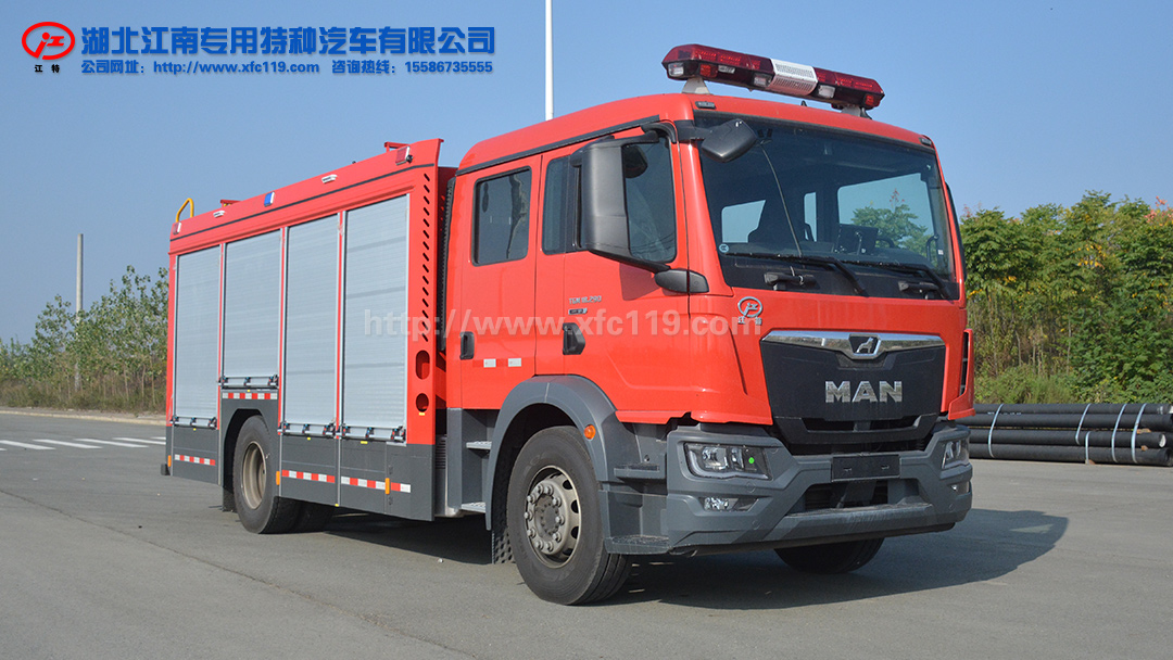 江特牌JDF5170GXFPM70/M6泡沫消防車,整車主要由德國曼恩商用車輛股份公司生產的TGM18.290 B底盤改裝而成、整車由消防員乘員室和車身兩大部分組成,乘員室為原廠雙排,可乘坐2+4人,該車為內藏罐結構,車身前部中間為水罐,兩側為器材箱,后部為泵房。采用進口CB10/60消防車,進口PLKD8/48電控消防炮,整車改裝后載荷分配均勻,質心位置和穩定性計算精確,內部空間布局合理,能充分滿足操作人員的使用。