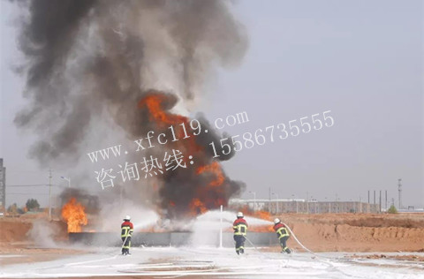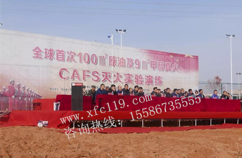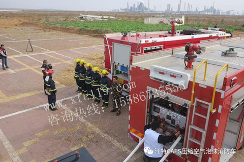 演練中使用的湖北江南專用特種汽車限公司制造的裝載德國CAFS系統的石油石化工業主戰消防車 。
