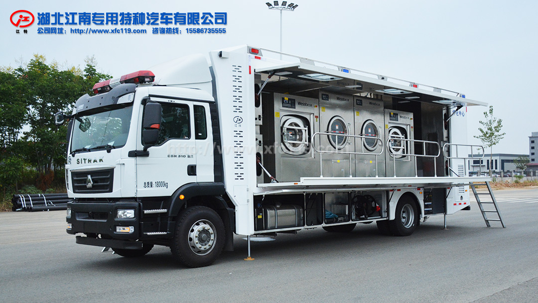 湖北江南專用特種汽車有限公司“江特牌”被服洗滌車系列產品,專用于提高野外執行任務保障能力。廣泛適用于軍隊、公安特勤、消防、醫療衛生、搶險、應急救援等多種用途。車內配置齊全,完全滿足在野外搶險救援、醫療救護、救災、突發事件等情況下的被服洗滌保障用途。整車主要由機動性能較高的二類底盤、兩側拓展翻板系統、水電保障系統、洗滌設備等組成。該車主要特點: